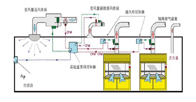 实验室通风系统设计控制方案主要有定风量(CAV变频)系统和变风量(VAV智能)控制系统。