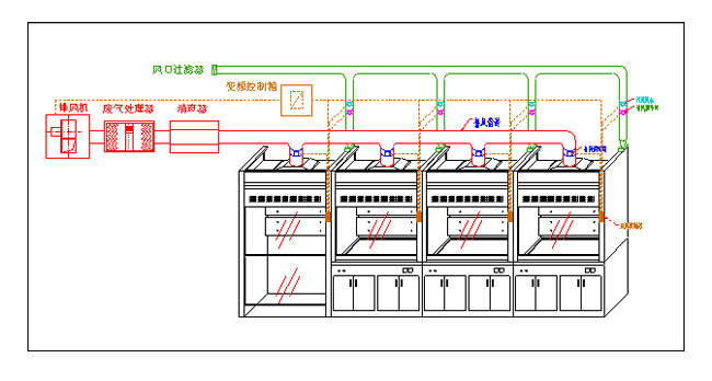 为达到设计合理、控制灵活、节能环保、运行稳定的目的,排风系统采用变频控制系统,既3台(含3台)以上通风柜共用排风管道的系统为变频控制系统,补风系统采用独立风机,共用补风管道的单独控制系统,各补风性通风柜并联在一起共用补风主管;补风风机经过补风调节阀门、补风支管,由通风柜操作窗下的补风口补到通风柜内。总体设计的排风风量大于补风风量15%。这样既能保证实验室内温度相对稳定及良好的气流,又能保证室内有一定的负压,防止通风柜内有毒有害气体溢出。