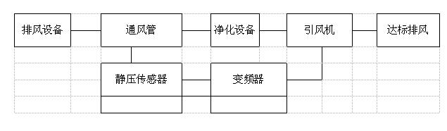 根据开启通风末端的装置数量的多少,静压传感自动变频控制通过静压传感装置将其感应到的管道内静压转变成0-10v的电信号输入变频器从而自动调节风机频率。当通风末端的装置数量增多或减少时变频系统会自动调节风机的频率,改变风机转速,调节管道内风量与流速,从而使开启的通风系统达到一定的节能效果;当最后一台开启的通风末端的装置关闭时风机也会自动关闭。