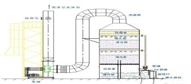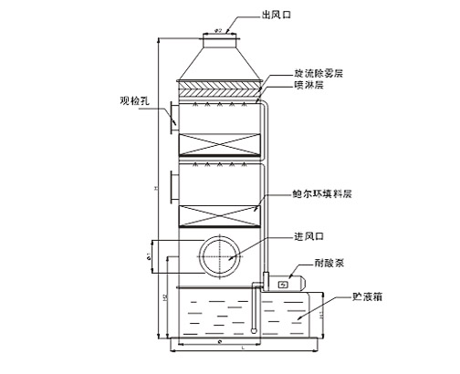 (2)塔身装有液体分布器,内部填充鲍尔环填料,气液两相传质面大,对废气中有害成份吸收效率高;