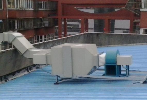 (4)风机、消声器、净化设备等均安装在楼顶,将系统的设备连接到楼顶进入到风机,由风机排放到大气中排风口高于楼面3米)以上。